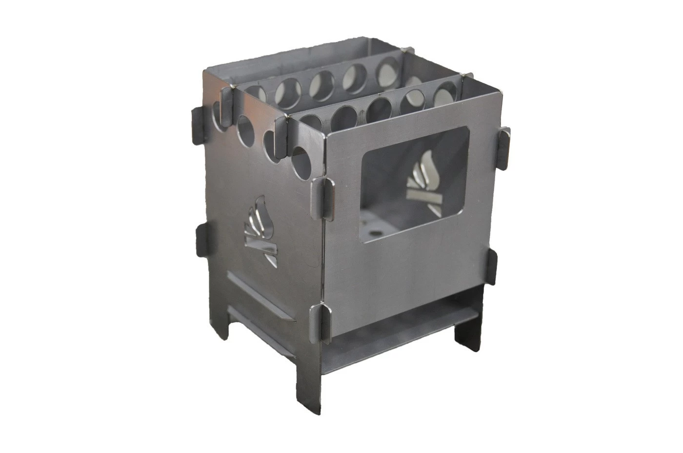 Le Bushbox intègre 2 supports de casseroles et une plaque évitant que les cendres tombent sur le sol. La recharge en bois se fait par une encoche située sur un côté du réchaud.