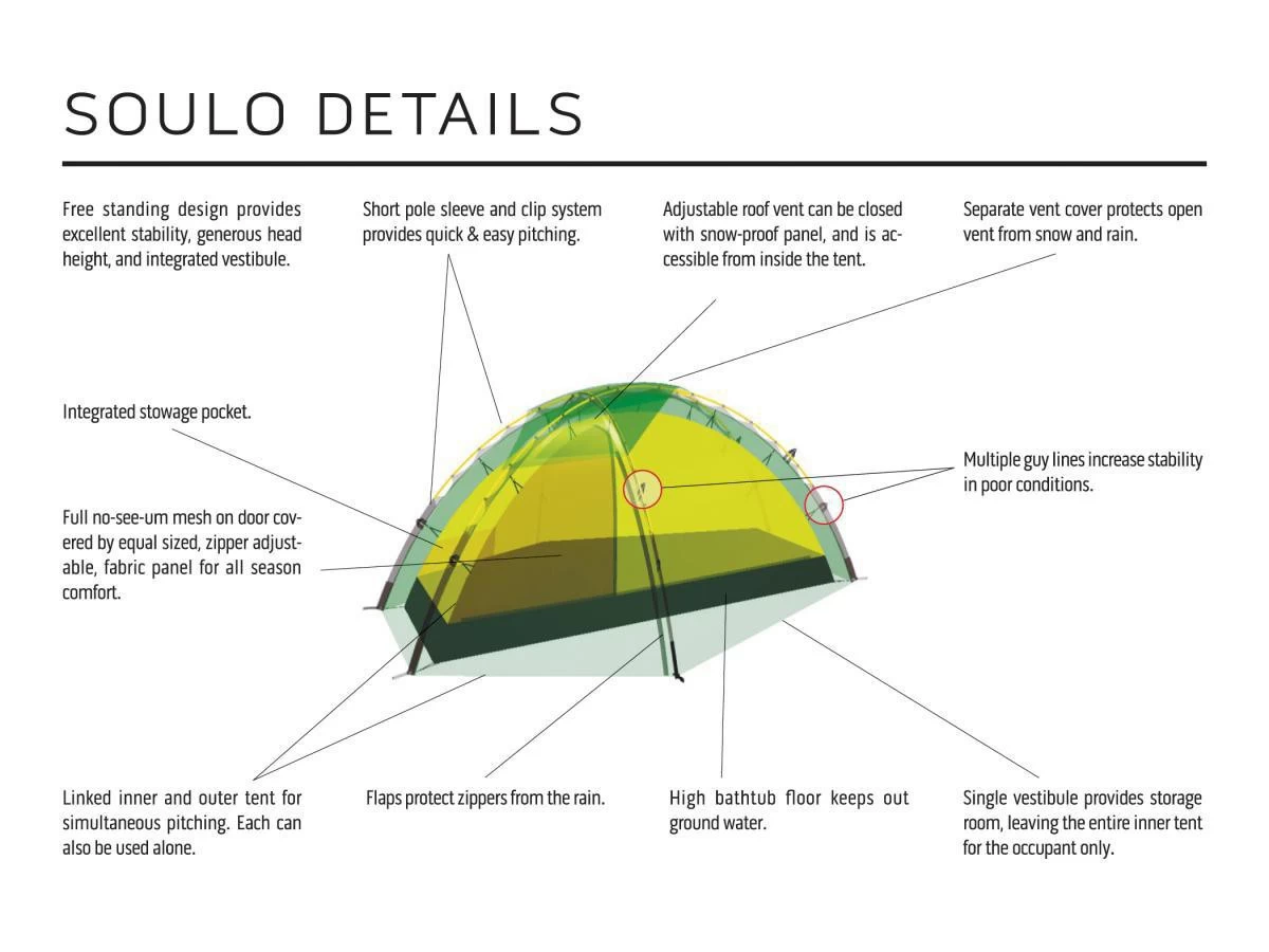 La Soulo d’Hilleberg est une tente 1 personne combinant légèreté et espace intérieur spacieux. La Soulo emprunte les caractéristiques techniques de plusieurs modèles de tentes Hilleberg :