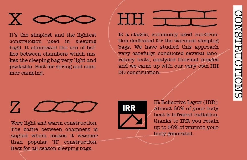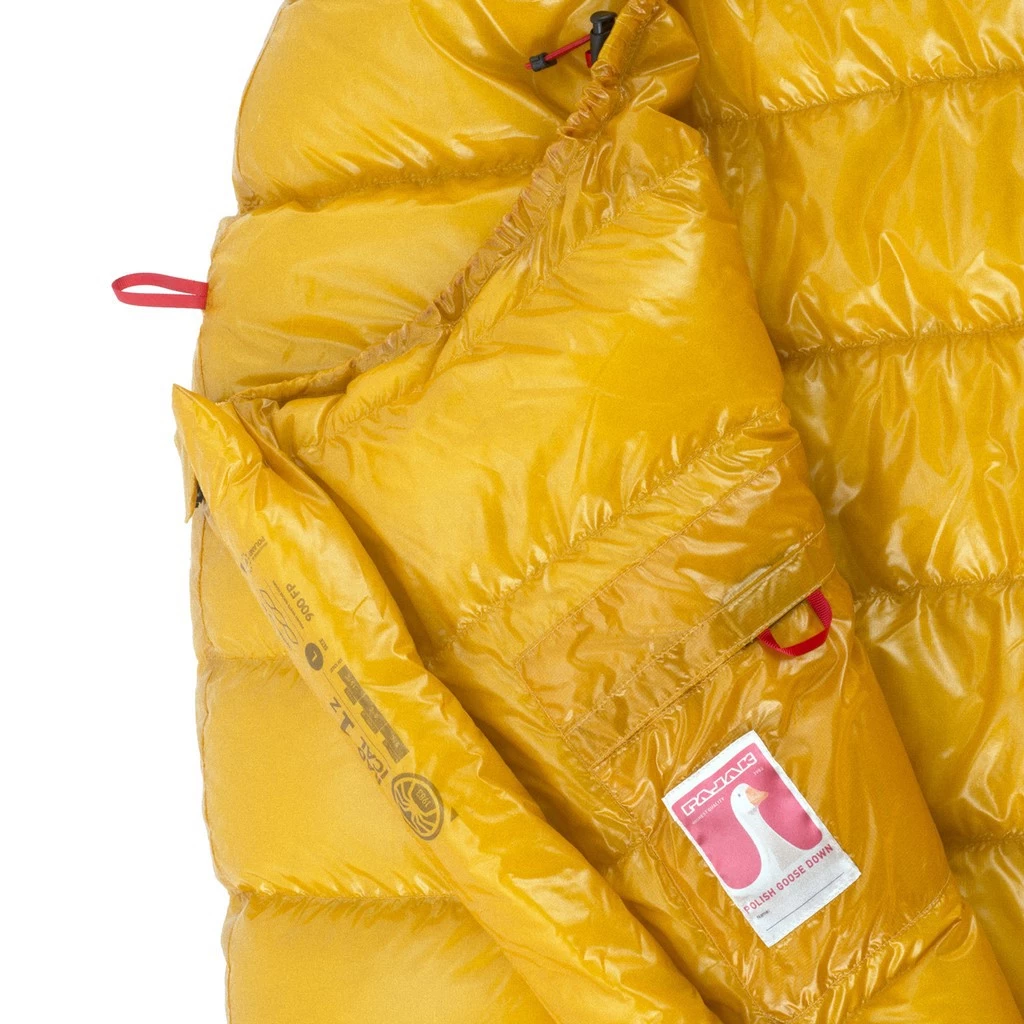 Il est doté d’un garnissage en duvet d’oie polonais 900 cuin, répartition 95/5. L’enveloppe en Gelanots Ultra Light Ripstop Shella a subi un traitement hydrophobe tout en laissant le tissu respirer (évacuation de la condensation). La construction cloisonnée en Z évite les ponts thermiques et maximise l’isolation.