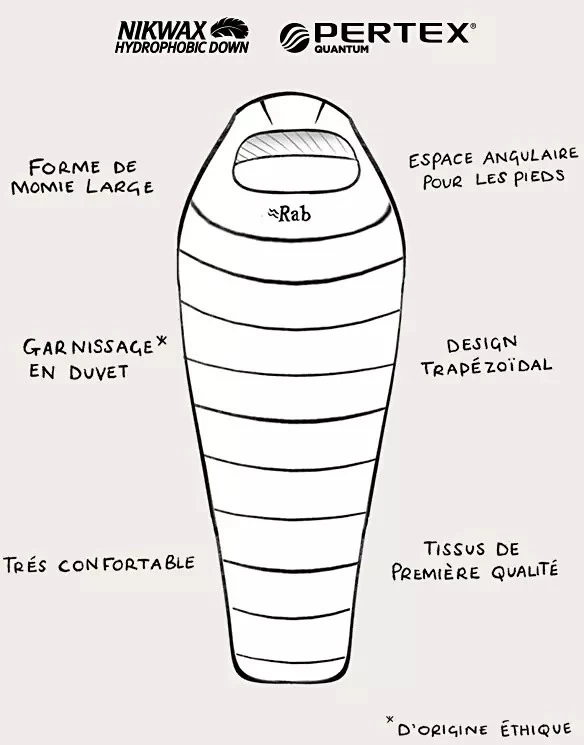 L’Ascent 500 de Rab est un sac de couchage garni avec un duvet de canard européen hydrophobe certifié RDS de 650 cuin. Il contient 500 grammes de duvet pour une température de confort de 1°C. Il est doté d’une fermeture éclair longue à double curseur, avec un rabat anti-froid, ainsi que d’une collerette avec cordon de serrage, d’une poche interne zippée et d’une capuche enveloppante avec un cordon de serrage. Il est disponible en taille standard (taille R) ou long (taille L) pour les personnes mesurant plus de 185 centimètres.