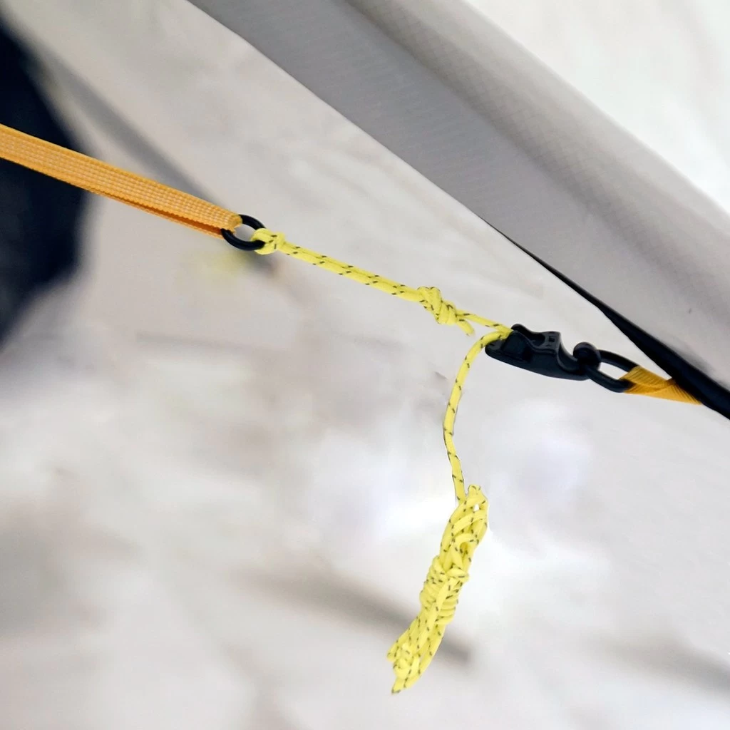 Le montage extrêmement simple nécessite soit 2 bâtons de randonnée, soit deux mâts (vendus séparément) et 6 sardines (vendues séparément). Des sangles réglables à chaque coin permettent de bien tendre l’ensemble, assurant la stabilité de l’abri. Spacieux pour deux personnes, elle dispose également d’une hauteur convenable de 114 centimètres. Ses deux larges portes s’ouvrent sur toute la largeur de la porte, favorisant l’accès et permettant d’admirer le panorama, même lorsqu’il pleut. Deux ouvertures sont situées sur le haut des portes, assurant la ventilation du tarp.