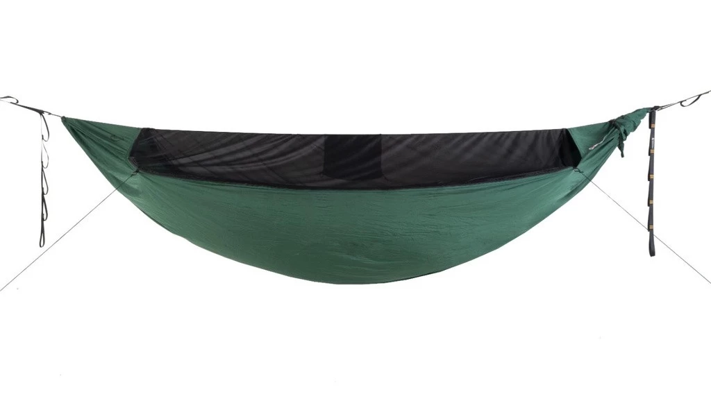 La ligne de crête intégrée permet de garder une forme confortable et de fixer le sac de rangement. Hamac réalise en nylon 20 deniers respirant et à séchage très rapide.